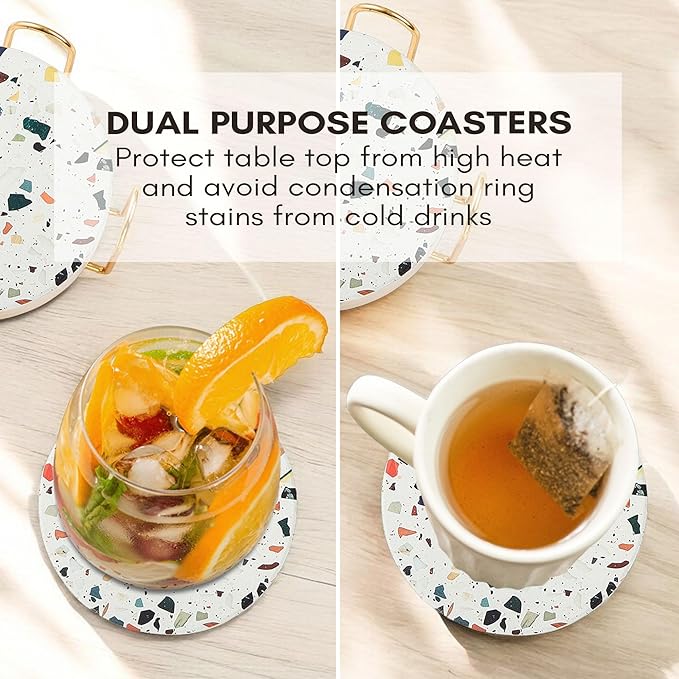 Terrazzo Drink Absorbent Coasters with Holder Set of 6, Ceramic Coaster for Drinks, Coffee Table Decor, Water Absorbing Stone Coaster for Drinks (Mosaic)