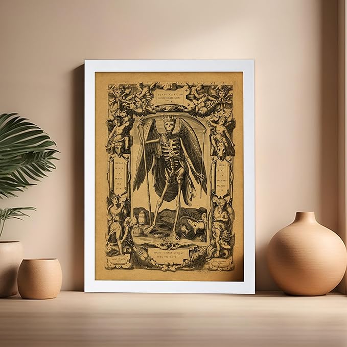 Poster Master Vintage Medieval Poster - Retro Gothic Print - Gift for Artist, Friend - Angel of Death, Memento Mori, Life, Skeleton, Dark - Wall Decor for Home, Living Room, 16x20 White Framed