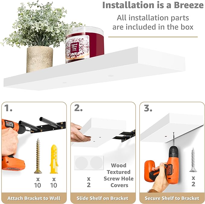 - Versatile & Functional Floating Wall Shelves: Install these floating shelves in the bedroom or bathroom to hold beauty/hair products - Place your wall shelf under a mirror in the entryway or exhibit family photos gallery style in a long hallway - Use as bathroom shelf, book shelf for wall, wall decor for bedroom, over the toilet shelf, kitchen floating shelves, floating nightstand, kitchen decor, living room wall decor, display shelf, and more