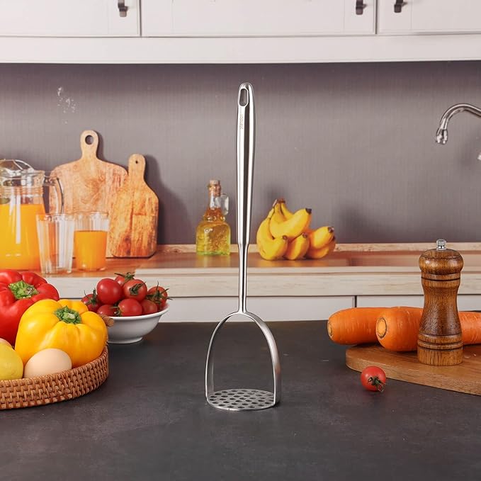 - 【12-Pieces Utensils Set】: 1 potato masher, 2 tongs(9.4in, 11.2in), 1 meat fork, 1 solid serving spoon, 1 slotted serving spoon, 1 spatula, 1 skimmer spoon, 1 slotted spatula tunner, 1 soup ladle, 1 spaghetti spoon, 1 large spoon. Fine matte brushed, silky smooth surface, giving your kitchen the finishing touch