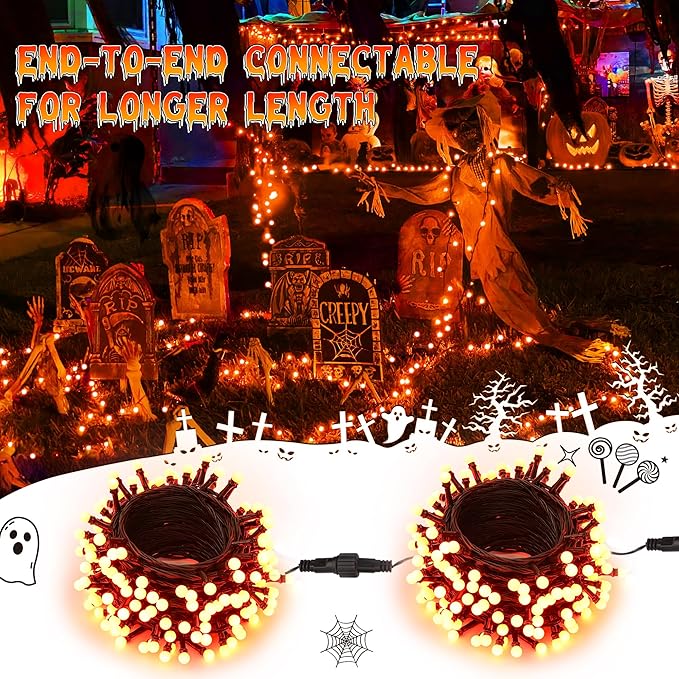 - End-to-End Connectable LED Halloween Lights: Per strand orange led string lights 66ft lighted length with 200 LED, features end-to-end safe plug for easy connect together, allows to connect a maximum of 2 strands(maximum 400 LED 132ft lighted length).