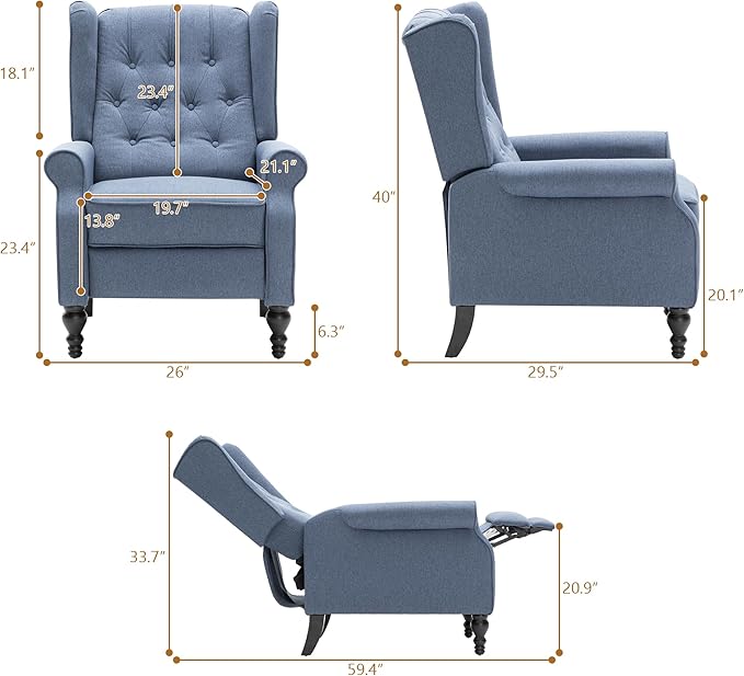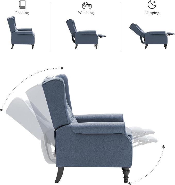 Mid Century Wingback Recliner Chair for Adults, Modern Linen Fabric Push Back Recliner Chairs with Button Tufted Upholstered Back & Footrest, Manual Recliner Chais for Living Room, Nursery, Blue