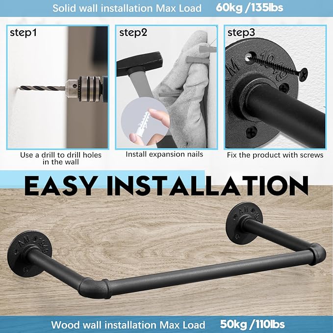 - 【Durable And Sturdy】The clothing rack is made of a 1" dia iron pipes, makes it durable. Also more importantly can holds up to 100 lb when mounted to a solid wall
