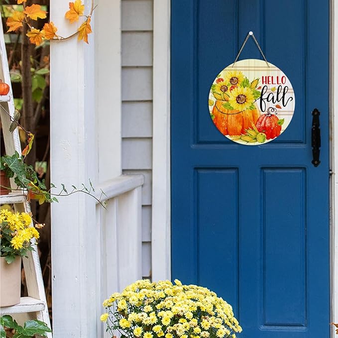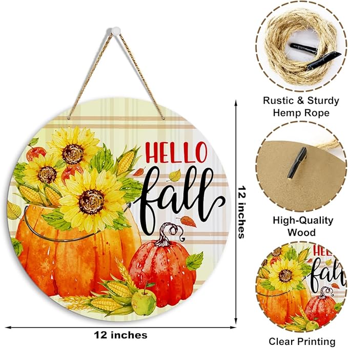 MIGUMUTU Rustic Farmhouse Fall Signs Door Wall Hanging Decor, Fall Home Decor, Fall Room Decor, Hello Fall Sign Sunflowers Wall Decor Decoration for Home Office Bedroom 12 X 12 Inch