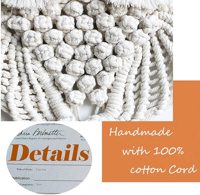 - 【Material & Size】: Our owl macrame wall hangings are made of 100% cotton and hand-made by workers. The size is larger compare with other owls in the market. Beautiful, eco-friendly decorative pendants for indoor use.