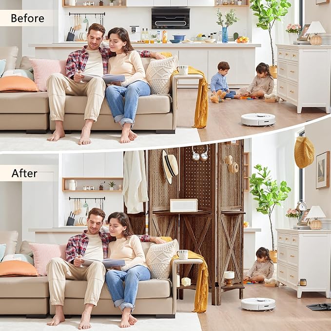 • Double Shelves Design - The exquisite double shelf design, skillfully integrated into the room divider, not only enhances the sense of hierarchy of the space, but also gives it practicality. The upper level can display your favorite artwork, photos or books, while the lower level can be used for plants, small ornaments or daily necessities, denying space clutter. Pegboard room divider design takes into account both display and storage needs, making your living space both beautiful and organized