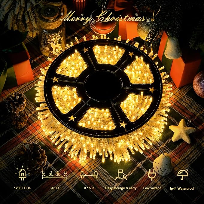 - 【Christmas Decoration Lights】Are you looking for the Warm White Christmas Lights which shine bright like a star? Our 1200 brighter LED string lights and longer 315ft, perfect for outdoor decorations. Light up your porch, yard, and garden or create a magical ambiance for parties, weddings, and Christmas holiday celebration
