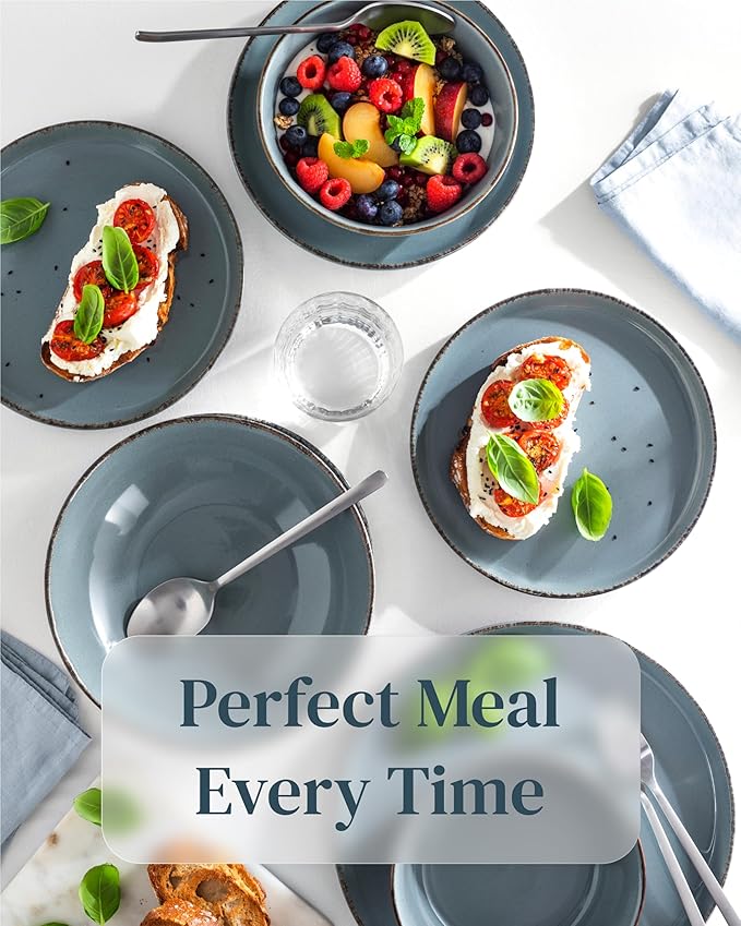 - ✅ BRING RUSTIC CHARM TO YOUR HOME: Elevate your dining experience with this 16-piece dinnerware set in smokey blue stoneware, adding a touch of rustic elegance and sophistication to your table setting