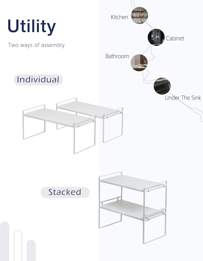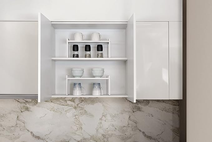 - STACKABLE: The product comes with two sets of cabinet shelves where you can stack one on top of another, creating 2-tiers double space to store household items under, in between or on the shelf. They are perfect to use as storage organizers in kitchen, cabinet, pantry, cupboard, and anywhere in your home or office for that wonderful extra storage space.