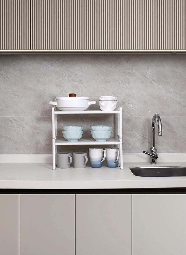 - CHARACTER DESIGN: This cabinet shelf can create plenty of space for your household items such as cups, pots, bottles, bowls, cookware, or canned foods without dominating space in your cabinet. This stylish cabinet shelf fits neatly on the countertop to keep your essentials organized and easily accessible.