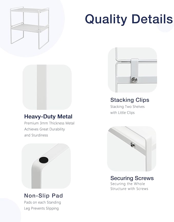 - STACKABLE: The product comes with two sets of cabinet shelves where you can stack one on top of another, creating 2-tiers double space to store household items under, in between or on the shelf. They are perfect to use as storage organizers in kitchen, cabinet, pantry, cupboard, and anywhere in your home or office for that wonderful extra storage space.