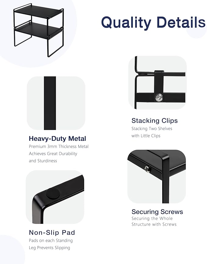 Nxconsu 2Pack Cabinet Shelves Stackable Shelf Organizer Rack Riser for Kitchen Cabinet Pantry Cupboard Counter Countertop Home Organization Storage Space Saver Heavy Duty Metal Nonslip Black Wide Tall