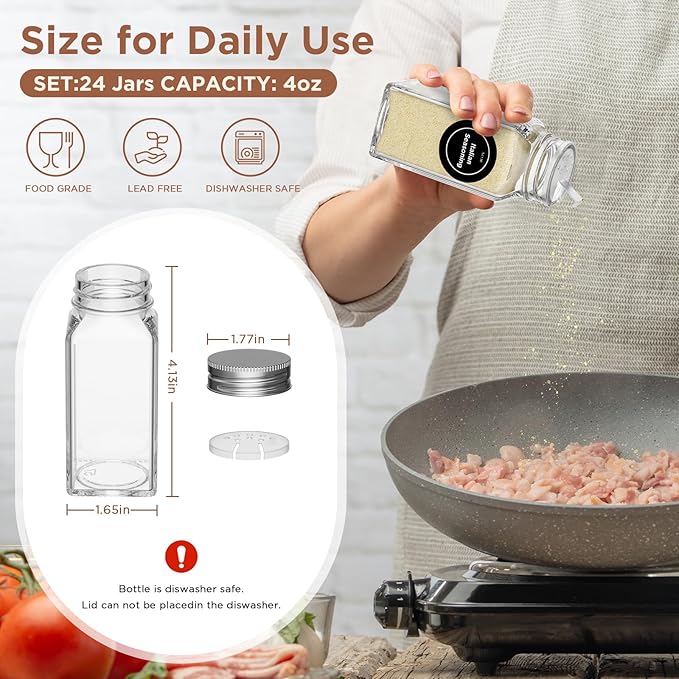 - 【Complete Spice Rack with Spice Jars Set】: This set of spice jars contains: 4 pack magnetic spice rack, 24 x 4oz glass spice jars with 4 sheets pre-printed labels and 1sheet blank label, 1 white pen , 1 silicone folding funnel (for refilling). All necessary accessories, in one box, no need to purchase separately. This set of seasoning containers with labels is the best choice for your kitchen.