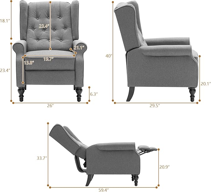 Mid Century Wingback Recliner Chair for Adults, Modern Linen Fabric Push Back Recliner Chairs with Button Tufted Upholstered Back & Footrest, Manual Recliner Chais for Living Room, Nursery, Gray