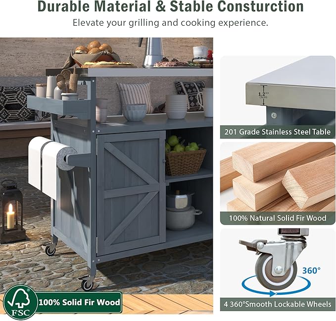 Outdoor Solid Wood Grill Table with Stainless Steel Top, Farmhouse Kitchen Island with Storage Cabinet, Outdoor Bar Cart with Internal Storage Rack, Spice & Towel Rack, Grey Blue