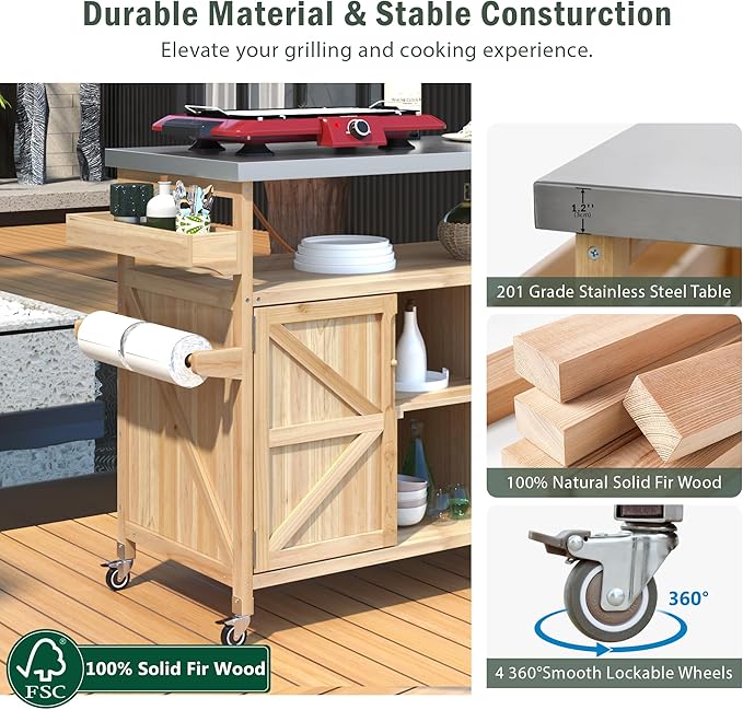 - Heavy Duty Structure: Crafted from 100% premium fir wood, this outdoor bar cart combines natural charm with a focus on skin-friendliness and minimal chemical coatings. The 1.2-inch thick 201 stainless steel tabletop provides a durable, easy-to-clean surface for food preparation, ensuring a long-lasting and sturdy product designed exclusively for your home.
