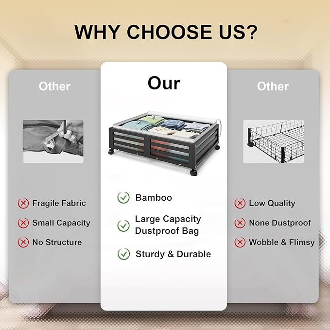 - ✅【Sturdy Under Bed Storage】:Our underbed storage units are built to last with high-quality 100% Real Bamboo,Beautiful appearance compared,oasting 4 rotating wheels with capacity of 120lbs, 48L large capacity dustproof cover bags hile the load-bearing capacity and durability are dramatically increased ,It's a versatile storage solution that can be customized based on your needs.