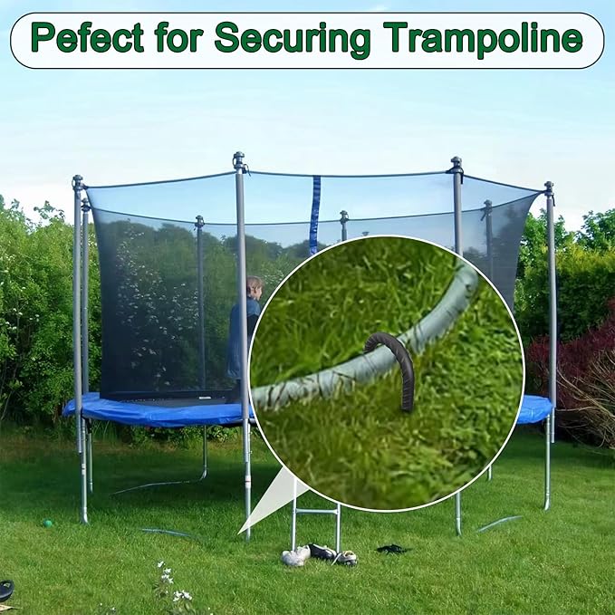 - 【Easy to Install】 No auxiliary tools required. The chisel pointed end makes the trampoline stakes penetrate into soil and hard surfaces easily. You can step on it to make the rebar stake penetrate deeper into the ground. The rebar surface provides strength to hold it in place and can stabilize anything on a windy, rainy day