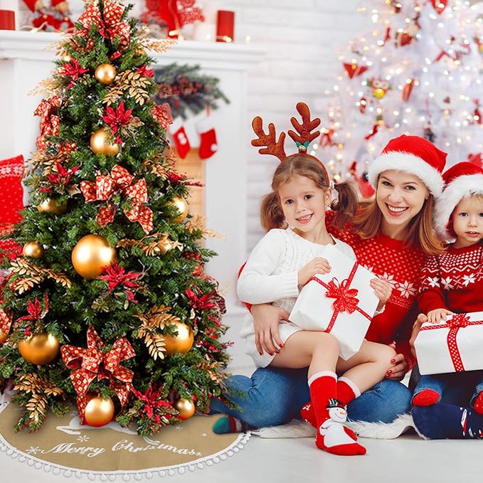 - Merry Christmas Tree Skirts:Our xmas tree skirt is printed with elk and various sizes of snow patterns, as well as the words "Merry Christmas." The edges are adorned with small, fluffy balls, adding a festive touch to your Christmas tree. This 30-inch tree skirt is perfectly sized for most Christmas trees perfectly. Before making a purchase, please measure the diameter of your tree to ensure a perfect fit