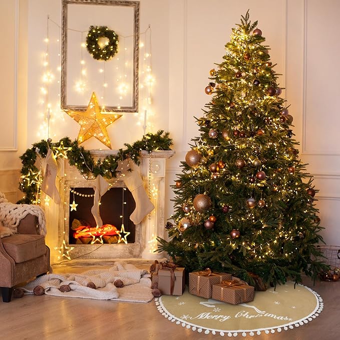 - Merry Christmas Tree Skirts:Our xmas tree skirt is printed with elk and various sizes of snow patterns, as well as the words "Merry Christmas." The edges are adorned with small, fluffy balls, adding a festive touch to your Christmas tree. This 36-inch tree skirt is perfectly sized for most Christmas trees perfectly. Before making a purchase, please measure the diameter of your tree to ensure a perfect fit