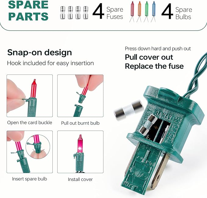 - ๐Unique Design Christmas Lights: The bulb is designed a snap-on design, preventing their dislodgment and prolonging their working lifespan. The stackable plugs facilitate effortless installation. Just plug in and unplug for power activation and deactivation. This is a highly distinctive design. String lights Comes with 4 Extra fuse& 4 Extra Bulbs for you to replace. You can replace damaged bulbs individually with the spare bulb or fuse provided by us.