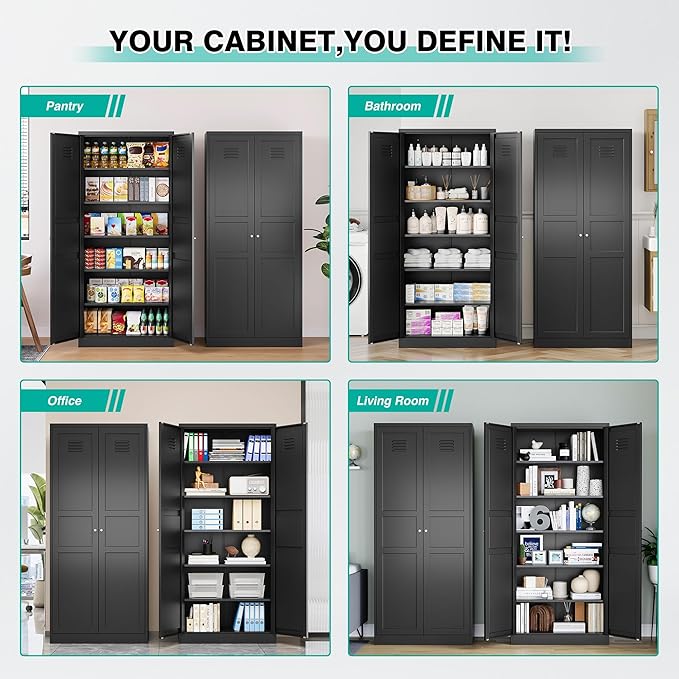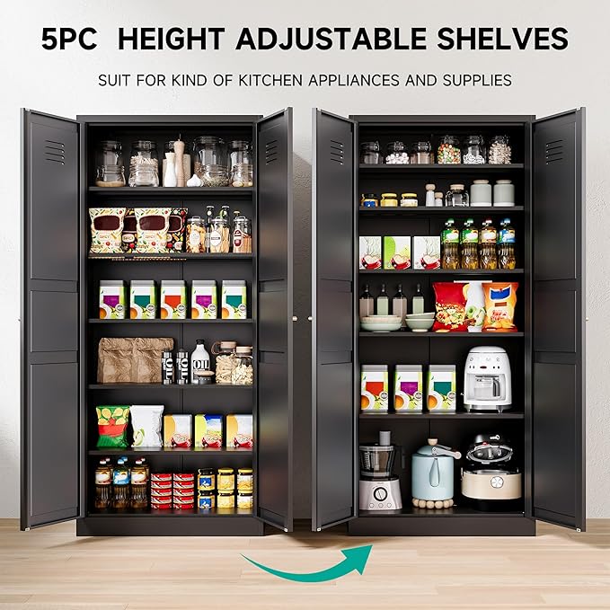 SISESOL Black Storage Cabinet,71" Tall Pantry Cabinet,Kitchen Pantry Storage Cabinets with 2 Doors and 6 Shelves,Wide Deep Metal Food Cupboard for Home,Kitchen,Dining/Living Room