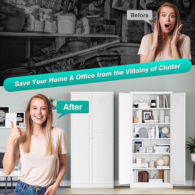 - 6 Tier-Large Capacity : Wide & Deep white storage cabinet with door have 6 tier for you to store kinds of sundries,toys,tools,food,kitchen appliances and supplies.Let you organize your space like a pro. Save your home from the villainy of clutter.