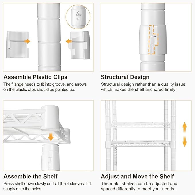 - [Easy to Assemble]: Read the included instruction manual carefully to learn the assembly steps. Also, you can scan to get the installation video. Using a rubber mallet to hit the side of the wire shelves is recommended during the assembly to make the shelving rack fit snugly on the poles (The rubber mallet is not included.)