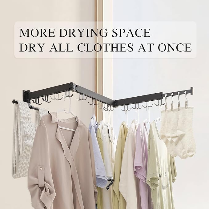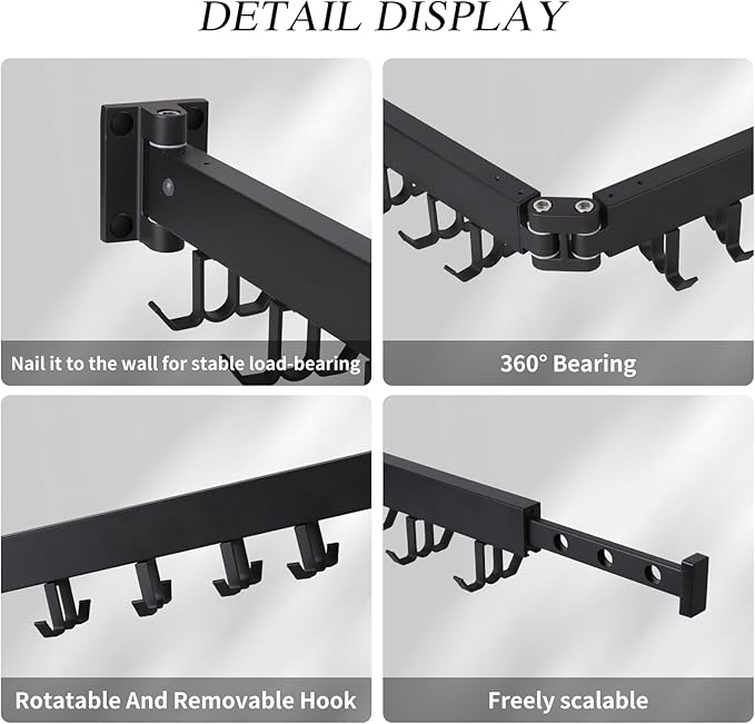 - More functionality: This drying rack clothing wall mount is different from other foldable wall mounted drying racks for laundry in that the upgraded hooks have a Bidirectional J-shape and loop combination, the upgraded telescopic pole has 6 windproof clips, and add a storage hanger pole