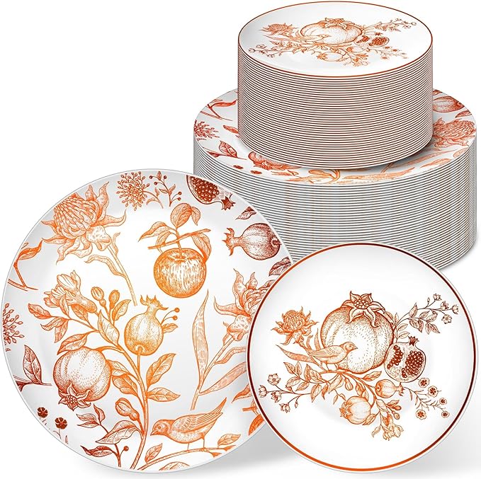 - Exquisite Pomegranate Design: our plastic party plates feature a distinctive ivory and vintage brown pomegranate design suitable for any occasion; Whether you are hosting a lavish wedding, a family reunion, retirement celebration, lunch, BBQ, self service, catering events, or a casual picnic, our plastic disposable plates beautifully set the mood