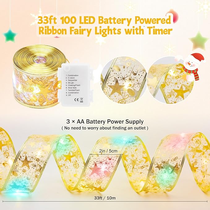 - 【 Christmas Ribbon String Lights 】- Powered by 3 × AA batteries, these ribbon string lights specially designed for Christmas trees are 33 feet long with 100 bright multi-color LEDs on a 2-inch-wide Gold ribbon. The beautiful ribbon pattern and medium-sized LED bulbs add a cheerful and romantic touch to your Christmas Tree.