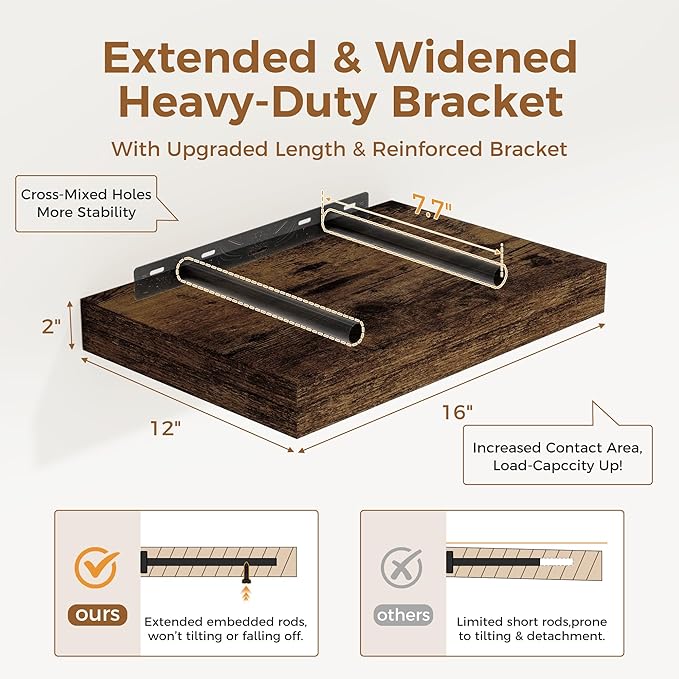 12 Inch Deep Floating Shelves, 16 x 12 Floating Shelf for Books, Rustic Wood Deep Wall Shelves for Home Storage & Display, 2" Thicked Shelves for Kitchen, Living Room, Bedroom, Rustic Brown, 2 Pack