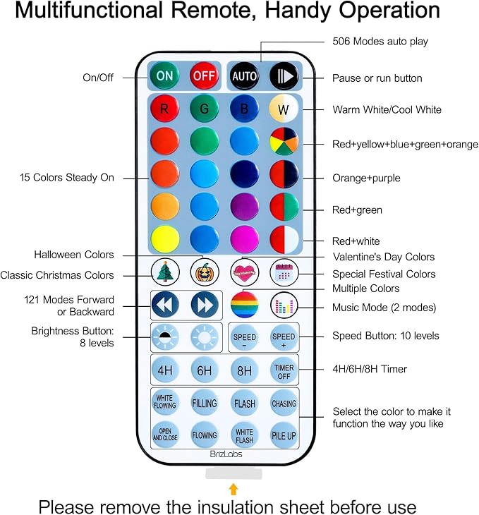 - Speed & Brightness Adajustable: our rgb string lights feature 17 soild colors, Multiple unique holiday colors(dual/triple colors/colored), 400+ modes. 8 levels brightness and 10 levels speed. Color is steady on adjusting brightness, dynamic modes adjust speed.【Note】The "W" key can switch between cool white and warm white. Among the 17 single colors, in addition to the three primary colors- red, green & blue, other colors will change to varying degrees with the adjustment of brightness.