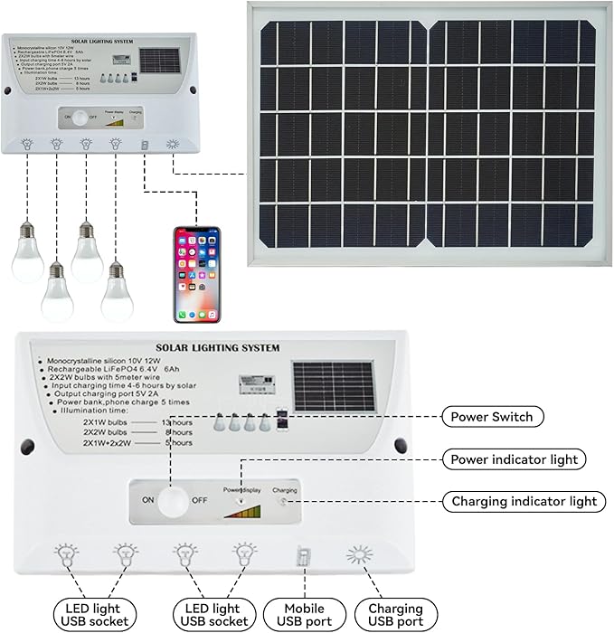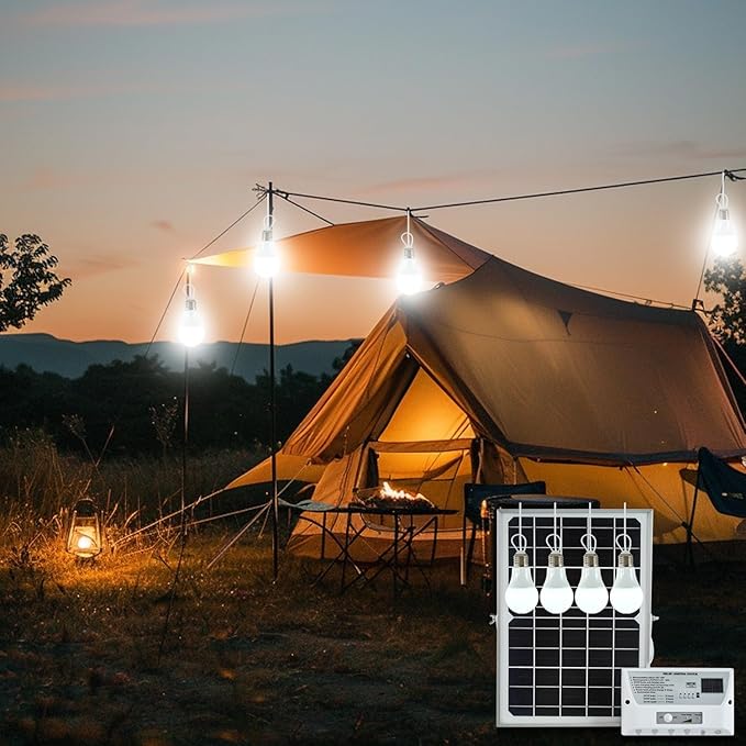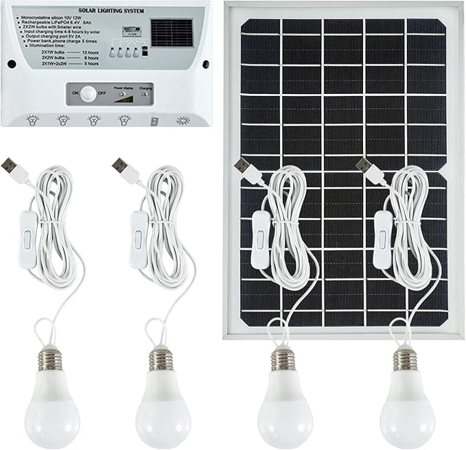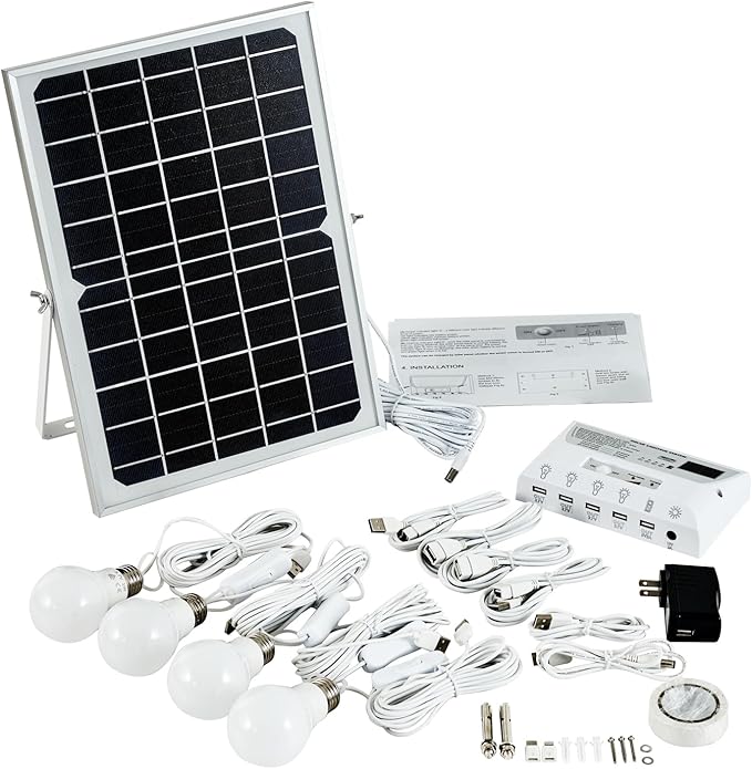 - Lightweight & Versatile for Indoor and Outdoor Use: This solar panel light kit includes a compact lighting system, a handle-sized solar panel, and 4 bright LED lights with independent switches. It’s lightweight and easy to carry, storing solar power to supply the 4 LED lights for up to 13 hours. Perfect for indoor and outdoor use, it serves as an ordinary security or emergency lighting solution for homes, sheds, barns, gardens, camping, and traveling.