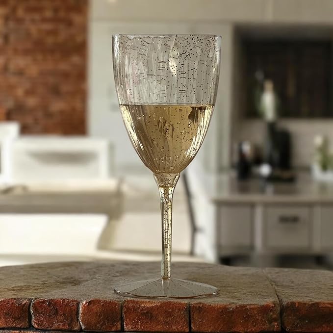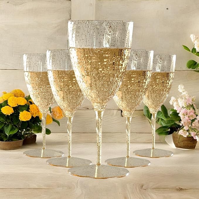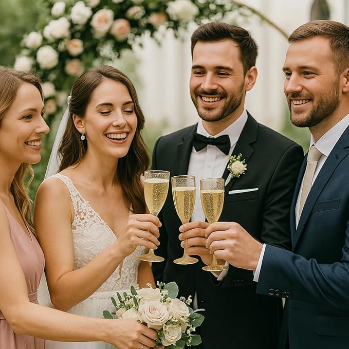 Oojami Elegant Plastic Champagne Flutes - 32 PCS, 7.8oz Disposable & Reusable Wine Glasses - Perfect for Home, Parties, Weddings, Birthdays & Celebrations (32, Gold Glitter)