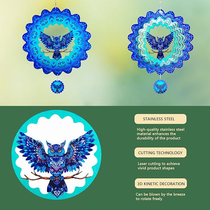 - 【Product introduction】: This 3D wind spinner is made of 12 inches and made of high-quality stainless steel. which adopts cutting technology and PUV printing to achieve a vivid owl shape.
