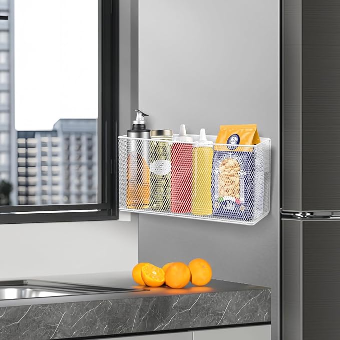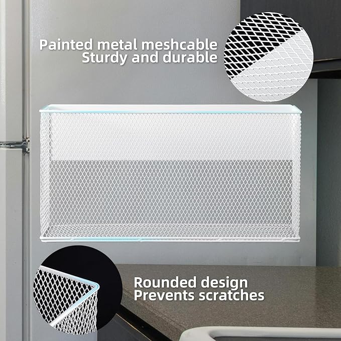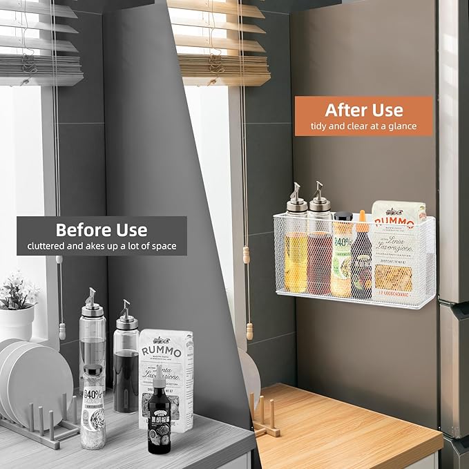 - Multi-purpose: The magnetic basket for fridge measuring 13.77" × 4.13" ×7.08 inches can not only store paper, magazines and newspapers, but also office supplies such as markers, pens, scissors, etc. It can also store condiments, preserving film, cereal boxes and other kitchen supplies