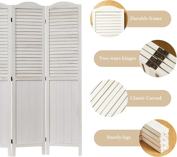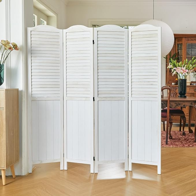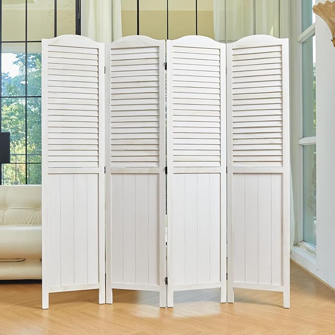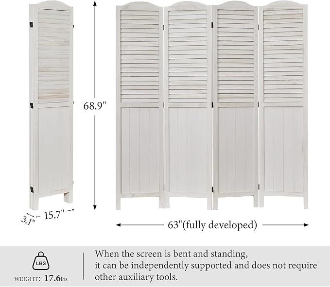- 【Classic Louver & MDF Design】The upper portion of the screens is ingeniously designed with louver, facilitating the ingress of sunlight and ensuring ventilation. The lower part of the wall divider is crafted from MDF, imparting additional weight and stability to the dividers. It emerges as an ideal option for those seeking a robust and long-lasting product. The top of the screen boasts a French-inspired rounded design, presenting a harmonious blend of practicality and aesthetic appeal.