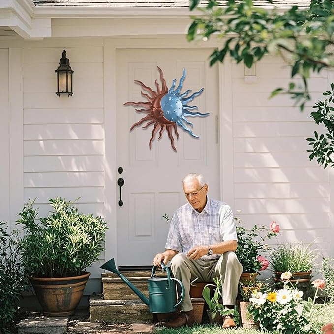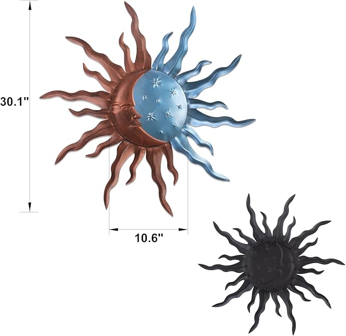 - Sun Moon Wall Art: Our outdoor Metal sun wall decor captures the harmonious partnership of the stars sun and moon in one enchanting composition, offering a unique decor metal wall art that adds a touch of magic to any outdoor or indoor space. can make ordinary walls vibrant and dynamic. This sun wall art is the perfect addition to living rooms, bedrooms, kitchens, offices, hallways, decks, gardens, patios, fences and entryways.