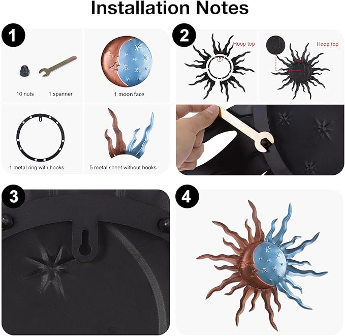 - Easy to Install:The large outdoor metal wall decor you receive is unassembled,and has been improved and upgraded.No extra tools are needed, just point the edge of the sun at the hole and tighten the screws.Each metal sun moon has a keyhole on the back,so you can easily hang it on the wall or fence.