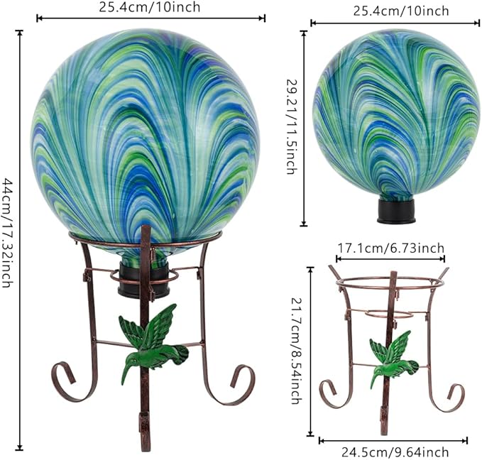 - PERFECT SIZE: This gazing ball is 10 inches in diameter and 11.5 inches high.The base of the gazing ball is 1.5 inches high and 2.1 inches in diameter.The gazing ball stand is 15 inches hih.The rubber cap on the bottom protects the edges from damage from bumps and vibrations and makes this gazing ball easier to display on a stand (stand included)