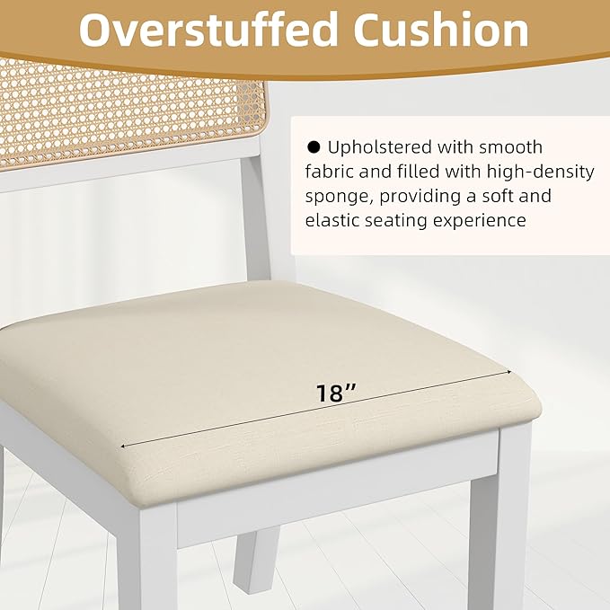 Westice Rattan Dining Chairs Set of 4, Farmhouse Natural Dining Room Chairs with Upholstered Cushion, Wood Armless Chairs for Kitchen/Restaurant, White