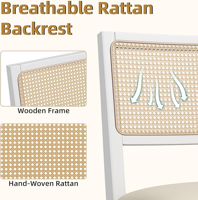 - 【Breathable Rattan Back】The hand-woven kitchen chairs with a natural open-weave design and rattan back promote good airflow, making them exceptionally comfortable, especially in warmer climates. The inherent flexibility of rattan adds a gentle give, further enhancing seating comfort