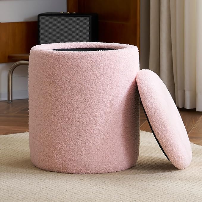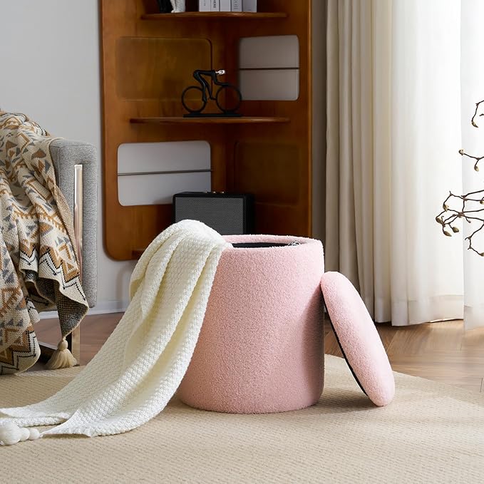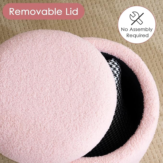 YFO Round Ottoman with Removable Lid Upholstered, Multifunctional Vanity Chairs for Makeup, Soft Footrest Stool Ottoman Foot Stool for Living Room, Bedroom, Boucle, Pink