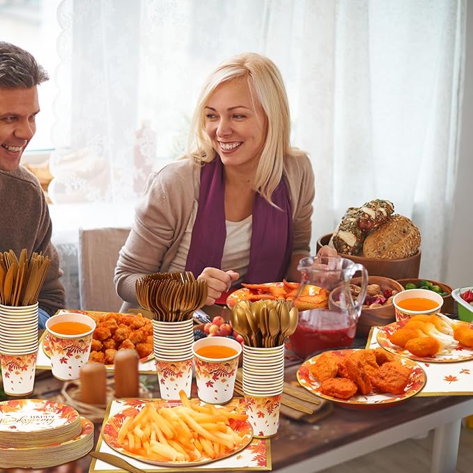 - Happy Thanksgiving Theme Design: our disposable Thanksgiving tableware set features stunning designs with vibrant maple leaves; These artistic and elegant designs will lend a decorative touch to the party setting; Watch as our tableware transform ordinary setups into remarkable dining experiences; Your guests will be delighted by our plates' subtle, yet striking aesthetic appeal