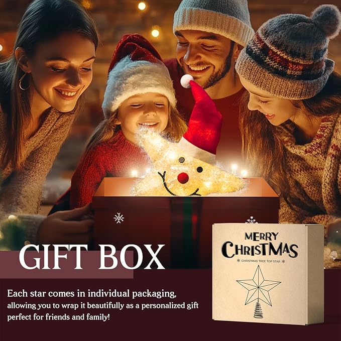 - ๐ CUTE SNOWMAN TREE TOPPER STAR: The snowman star wears a Santa hat with a cheerful smile that incorporates classic holiday elements, especially endearing. A string of warm white LED lights inside that glisten in the charming warm light, this star decoration adds sparkling elegance and vivacity to your Christmas tree