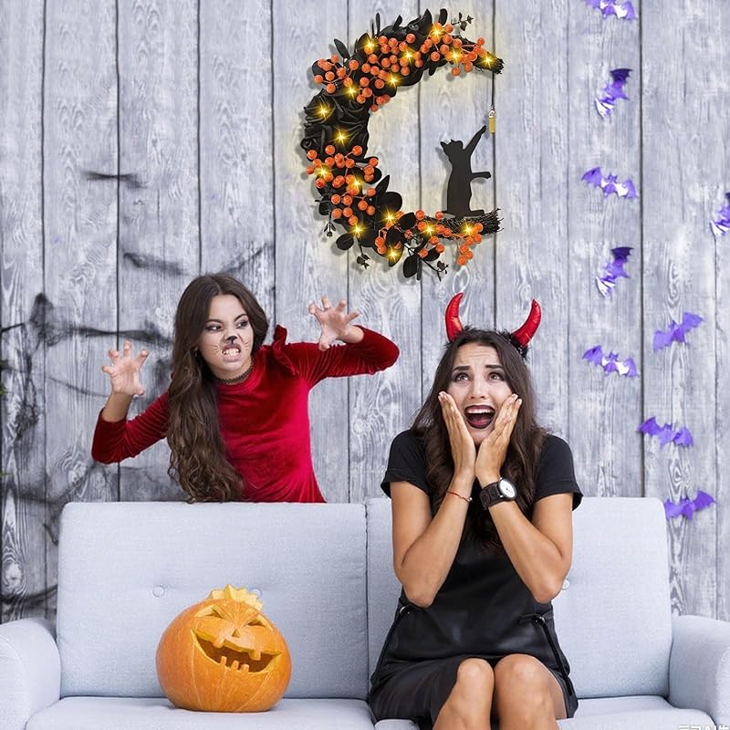 - Halloween Wreath Decorations: 2025 moon cat black halloween wreaths for front door adopts classic black cat, moon, rattan and roses Halloween elements! "Look, there's a kitten standing up and trying to touch the moon"! Very fun, create a mysterious and scary Halloween atmosphere for your home