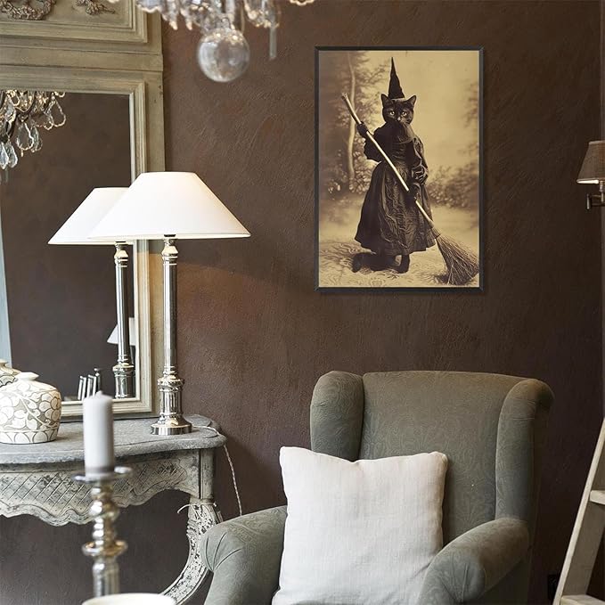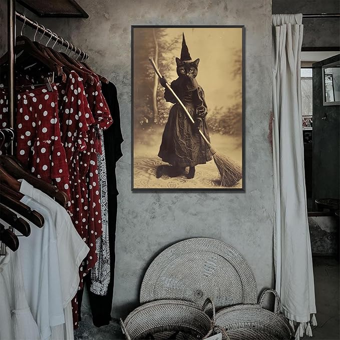 - Artistic Spooky Design: Features a vintage spooky print of a black cat witch performing cleaning chores. This dark academia themed poster canvas wall art serves as the ideal Halloween decor, lending an eerie, intriguing touch to your space.