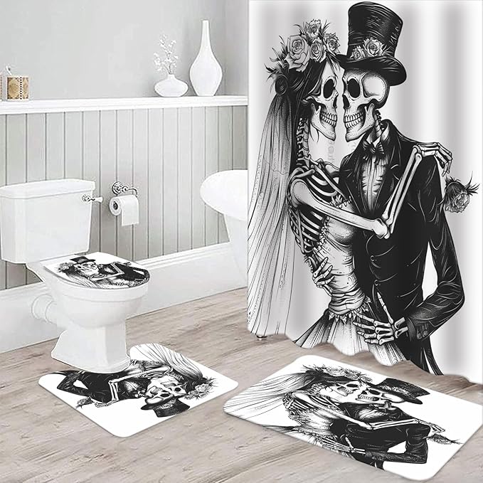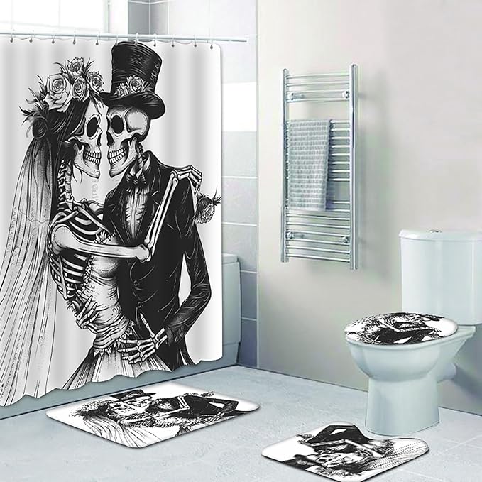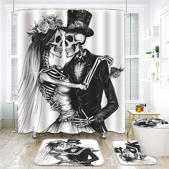 NEWSUYAA Halloween Decorations Shower Curtain Set with Non-Slip Rugs and Bath Mats,Black Skull Skeleton Bathtub Curtains with 12 Hooks,All Saints'Day (Nov 1st) Bathroom Decor