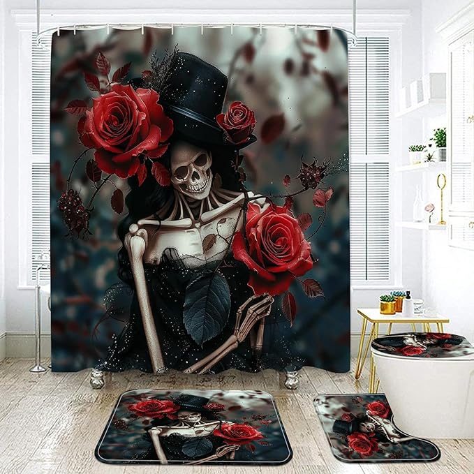 NEWSUYAA Halloween Decorations Shower Curtain Set with Non-Slip Rugs and Bath Mats,Black Skull Skeleton Bathtub Curtains with 12 Hooks,All Saints'Day (Nov 1st) Bathroom Decor